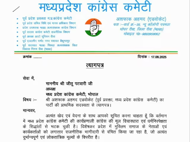रीवा जिले के वरिष्ठ कांग्रेसी नेता अशफाक अहमद ने नई सूची में अल्पसंख्यकों की अनदेखी का आरोप लगाते हुए पार्टी की प्राथमिक सदस्यता से त्यागपत्र दे दिया है। अशफाक अहमद कांग्रेस के पूर्व प्रदेश प्रवक्ता, अल्पसंख्यक विभाग के पूर्व उपाध्यक्ष और प्रदेश सचिव रह चुके हैं। वे कांग्रेस कमेटी के राजनीतिक विभाग के सदस्य भी थे और लंबे समय से पार्टी संगठन में सक्रिय भूमिका निभाते रहे हैं।