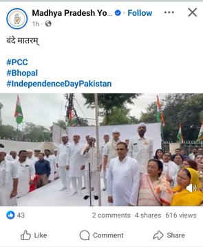 देशभर में आज आज़ादी का जश्न धूमधाम से मनाया जा रहा है। राजधानी भोपाल स्थित पीसीसी (प्रदेश कांग्रेस कमेटी) कार्यालय में भी ध्वजारोहण का आयोजन हुआ। लेकिन इस कार्यक्रम का एक वीडियो जब मध्य प्रदेश यूथ कांग्रेस की फेसबुक आईडी से शेयर किया गया, तो सियासत में तूफान मच गया। दरअसल, पोस्ट में लगाए गए हैशटैग में “Independence Day Pakistan” का भी उल्लेख कर दिया गया था।
