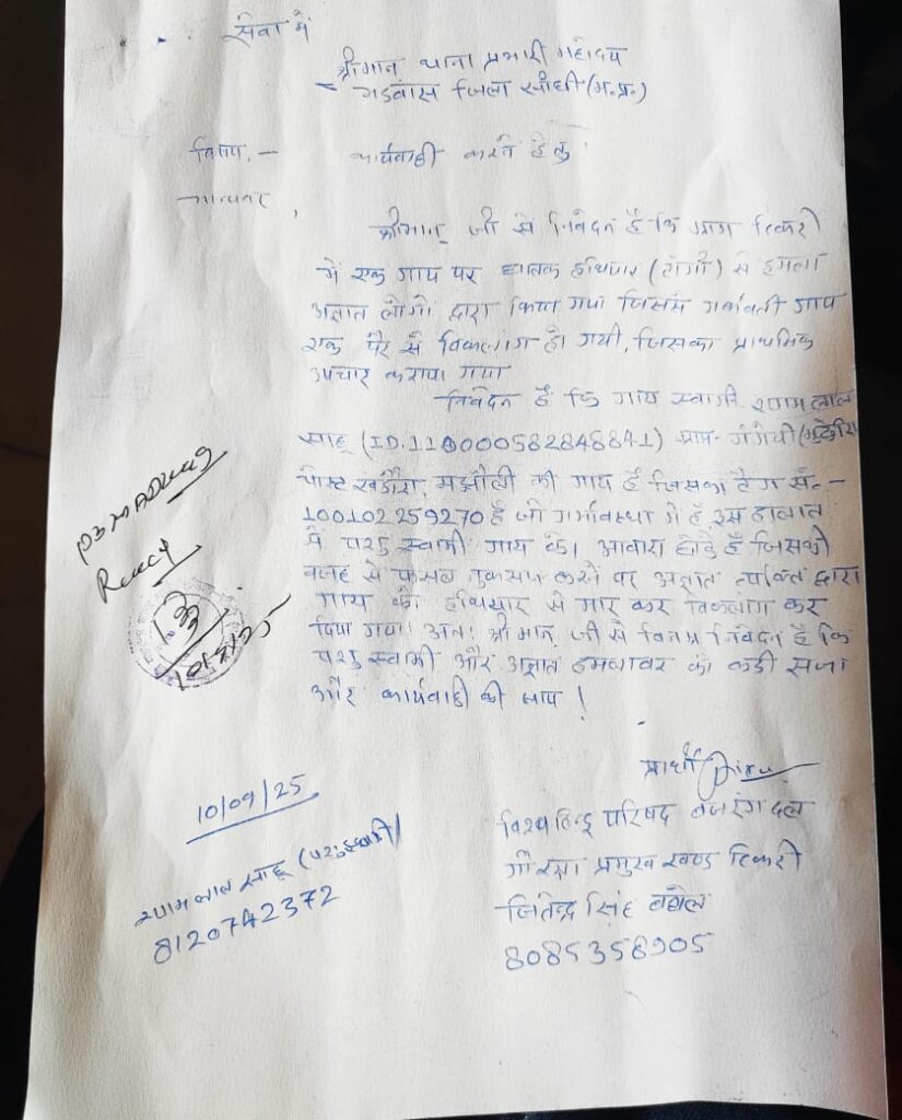 सीधी ज़िले के मड़वास थाना क्षेत्र अंतर्गत चौकी टिकरी से एक गंभीर मामला सामने आया है। 9 सितंबर 2025 की रात लगभग 8 से 10 बजे के बीच अज्ञात व्यक्ति ने एक गाय पर धारदार हथियार से जानलेवा हमला कर दिया। घायल अवस्था में लहूलुहान गाय टिकरी तिराहे पर पहुँची।
